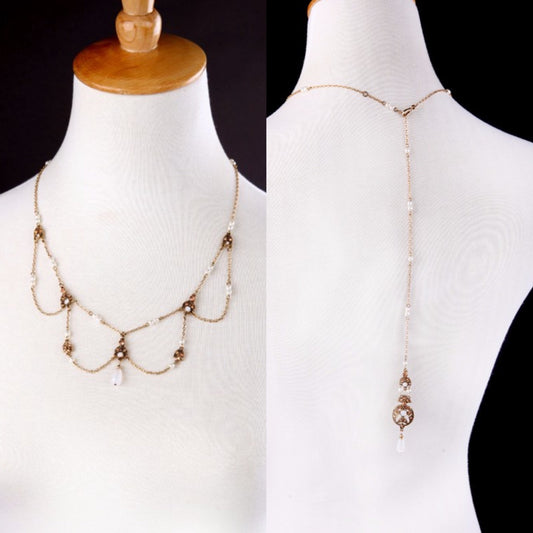Art Nouveau Pearl & Antique Gold Back Drop Necklace and Flower Earrings Bridal Jewelry Set