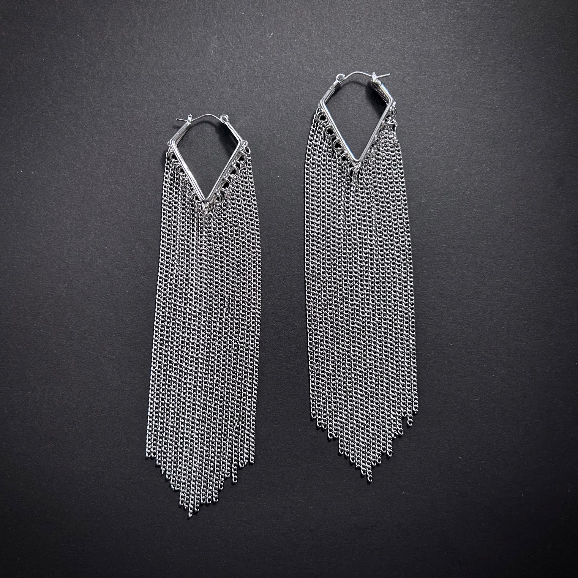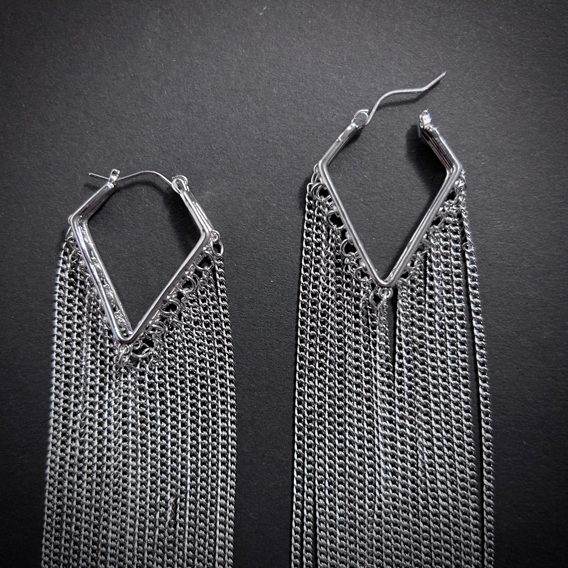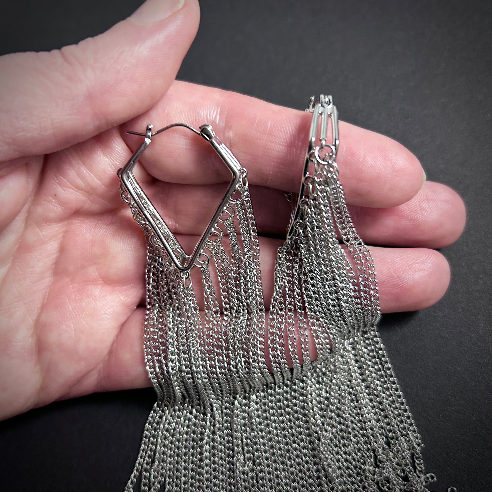 Gorgeous, cool and very striking statement earrings with extra long silver tone chains in two rows. They have exactly the right amount of weight to move beautifully without tugging on your ear.