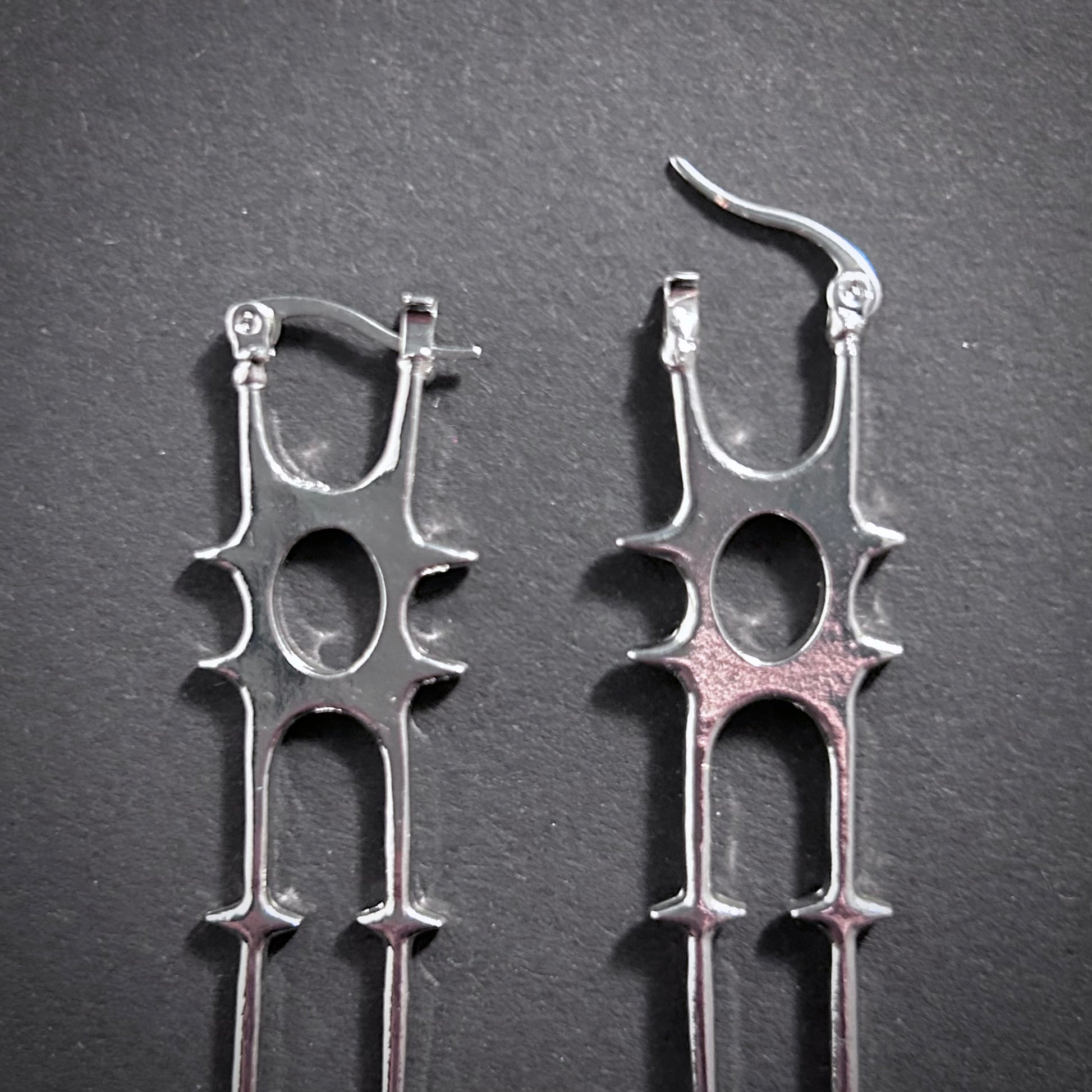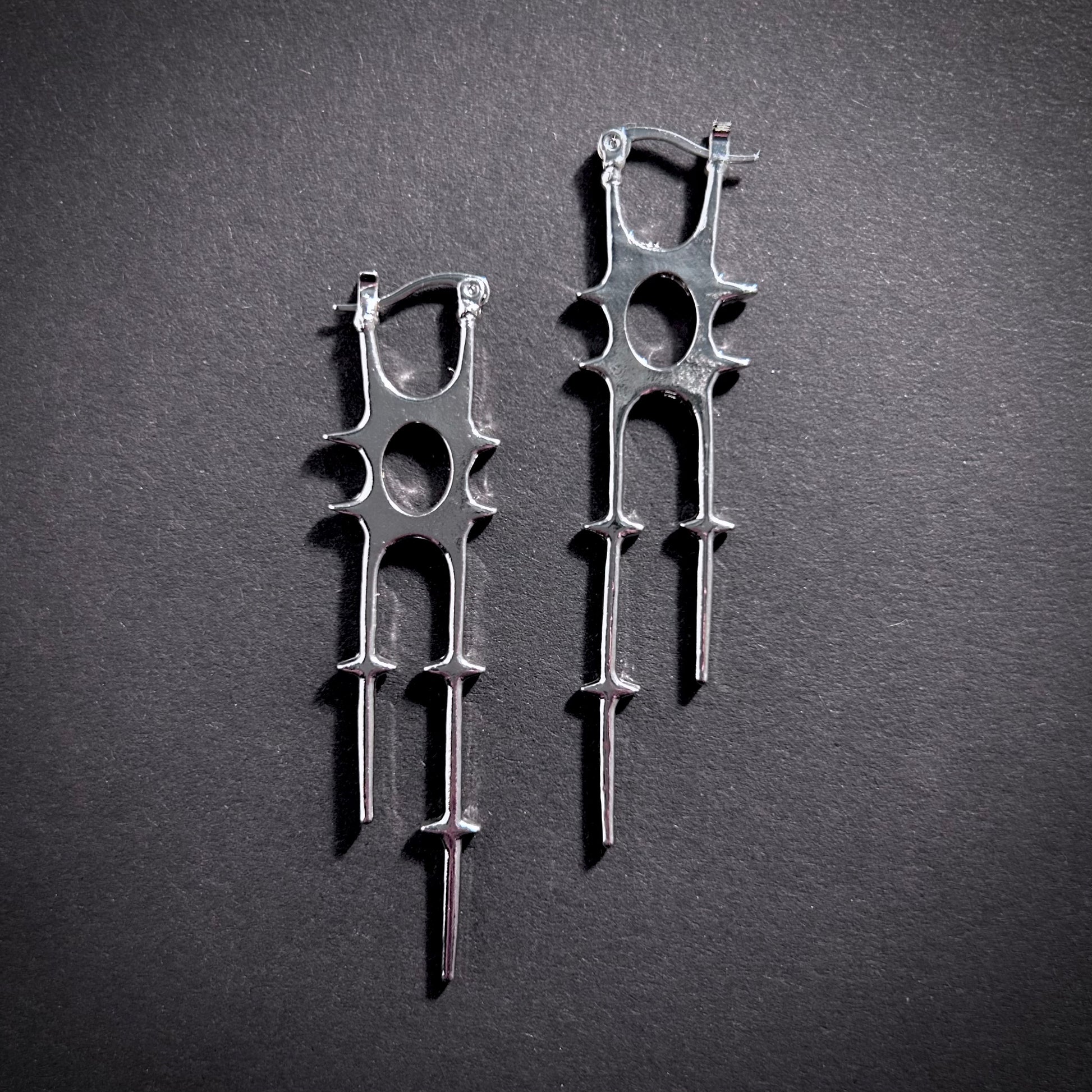 Super chic avantgarde style shiny silver tone geometric pattern earrings with spikes.