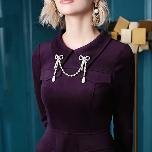 Two Bow Rhinestone & Pearl Connected Silver Brooch