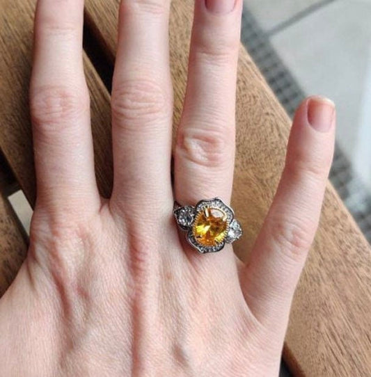 Art Nouveau Citrine Yellow & Silver Cocktail Ring