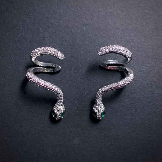 Snake Stud & Cuff Statement Earrings in Silver with Emerald Eyes