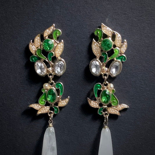 Green Leaves Enamel, Crystal & Milky White Long Teardrop Earrings