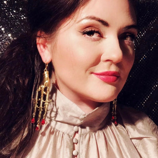 Hand, Dagger & Blood Drops Bad-Ass Golden Chandelier Earrings