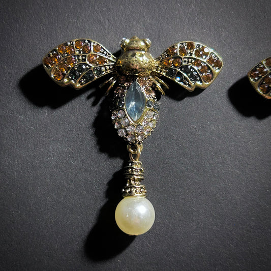 Art Nouveau Bee Antiqued Gold Rhinestone & Pearl Earrings in Amber & Grey