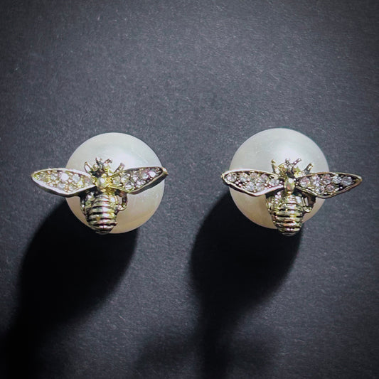 Gold Rhinestone Bee Earrings with White Pearl Back Stopper