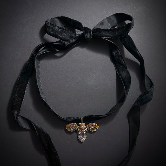 Art Nouveau Velvet Ribbon & Bee Antiqued Gold Rhinestone Choker Necklace in Amber & Grey