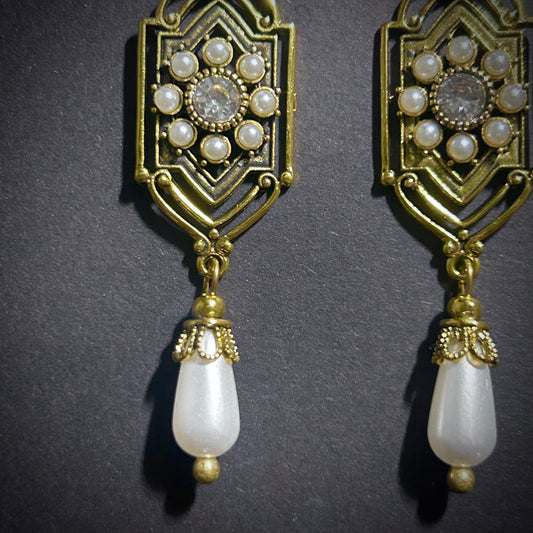 Art Nouveau Pearl & Rhinestone Geometric Gold Earrings