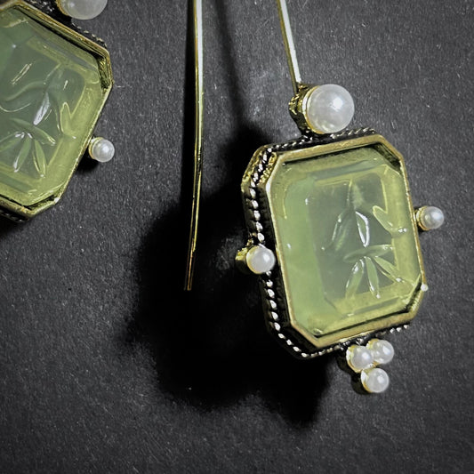 Art Nouveau Etched Green Stone and White Pearl Gold Earrings