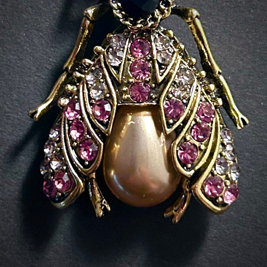Bee Pink Rhinestone & Beige Pearl Antiqued Gold Brooch