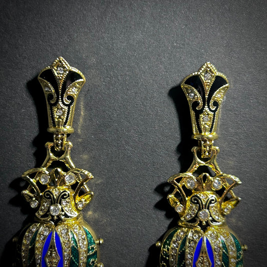 Art Nouveau Ornate Gold Earrings with Enamel in Dark Green & Blue