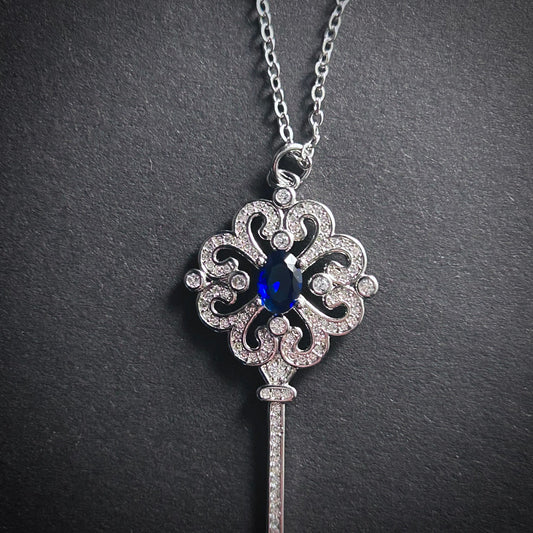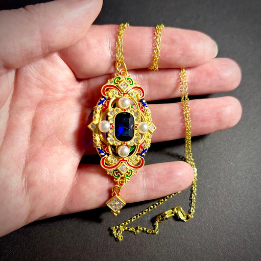 Art Nouveau Intricate Cloisonné Enamel, Sapphire & White Pearl Necklace