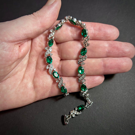 Emerald & Silver Vine Rhinestone Dainty Tennis Bracelet