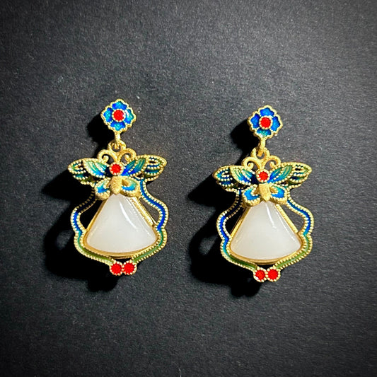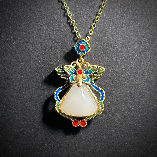 Art Nouveau Jade & Cloisonné Enamel Butterfly Necklace