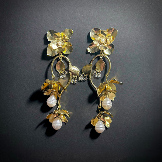 Flower, Pearl & Falling Petals Gold Statement Earrings