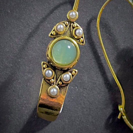Art Nouveau Etched Green Stone and White Pearl Gold Earrings