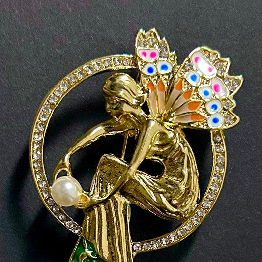 Art Nouveau Fairy Brooch with Cloisonné Enamel, Pearl & Clear Rhinestones