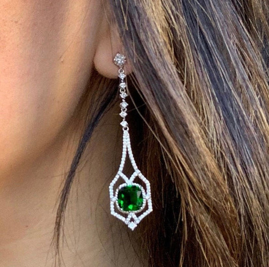Art Deco Silver Emerald Rectangle Large Drop Earrings