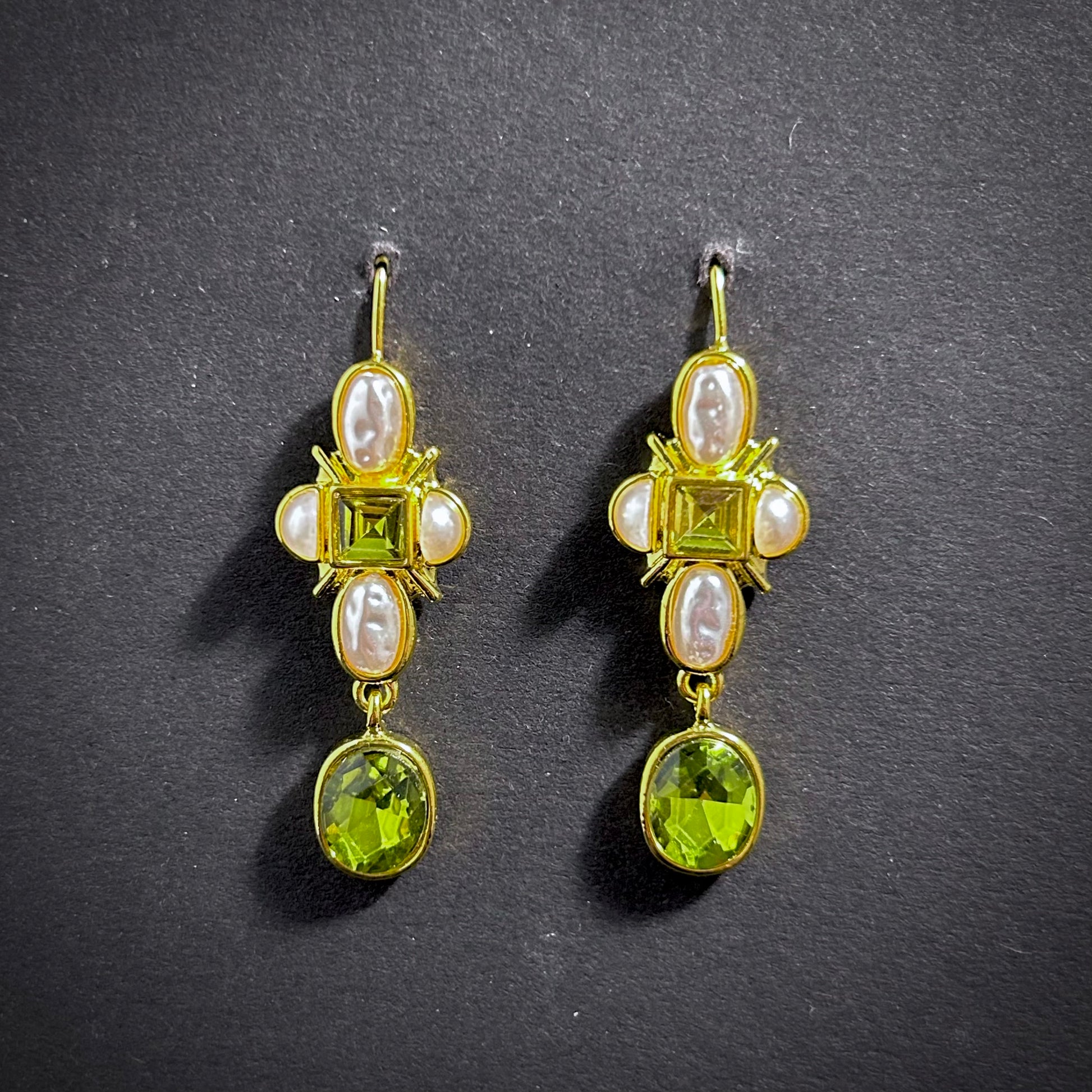 Exquisite Art Nouveau style earrings with apple green rhinestones and snow white faux baroque pearls in a shiny gold setting.