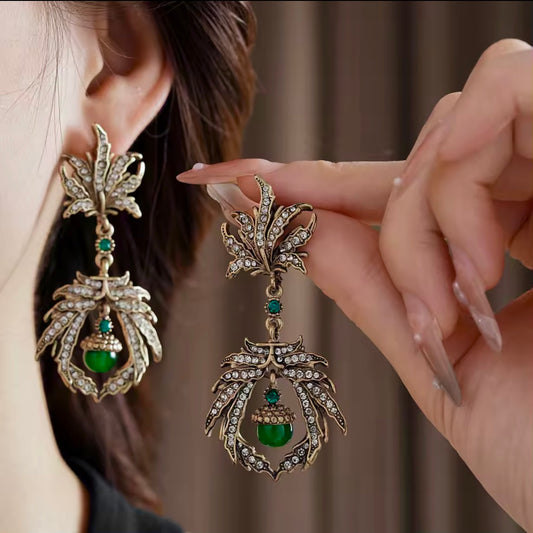 Art Nouveau Gold & Emerald Green Rhinestone Leaf Chandelier Earrings