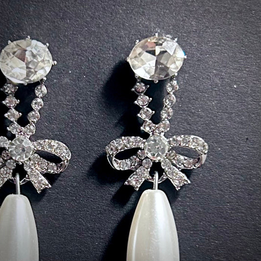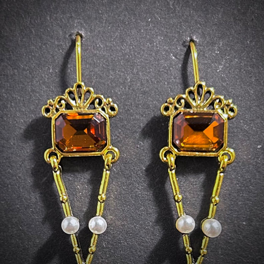 Art Nouveau Amber Brown Rhinestone & White Pearl Gold Earrings