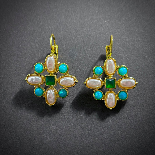 Art Nouveau Baroque Pearl & Turquoise Cross Gold Earrings