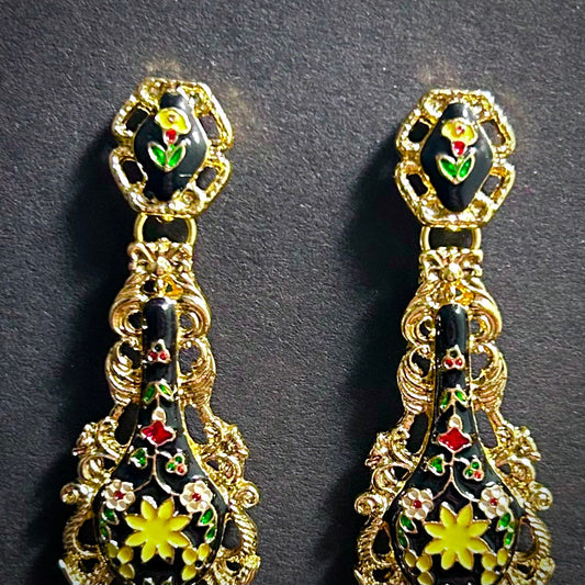 Art Nouveau Black & Gold Enameled Flower Pattern Earrings