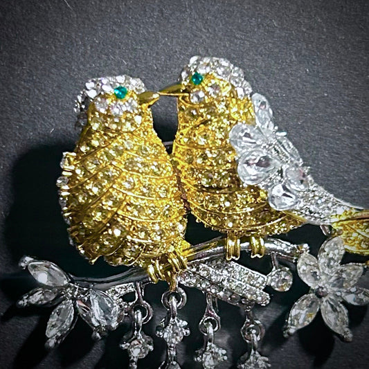 Lovebirds on Branch Sparkling Zircon Mixed Metal Brooch