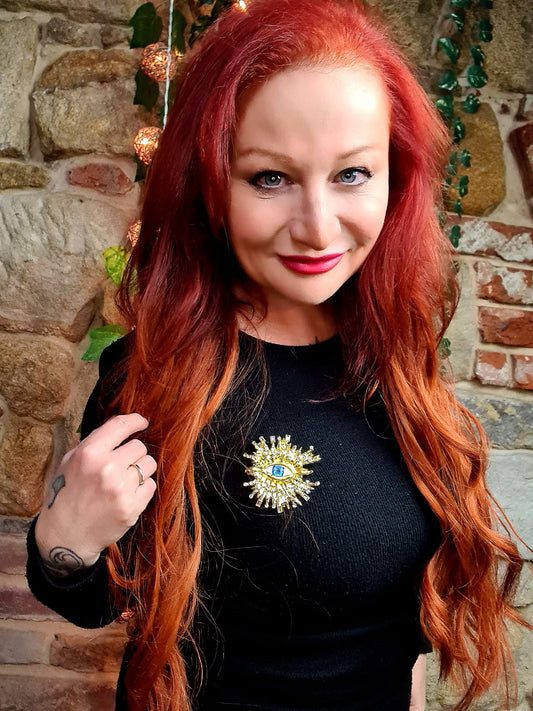 Blue Eye & Rhinestone Radiant Gold Surrealist Brooch