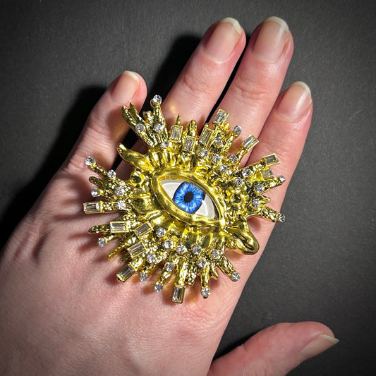 Blue Eye & Rhinestone Broad Fringe Large Gold Adjustable Surrealist Ring