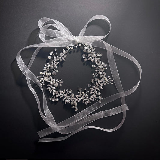 White Pearl, Rhinestone & Organza Wine Bridal Headpiece/Headband