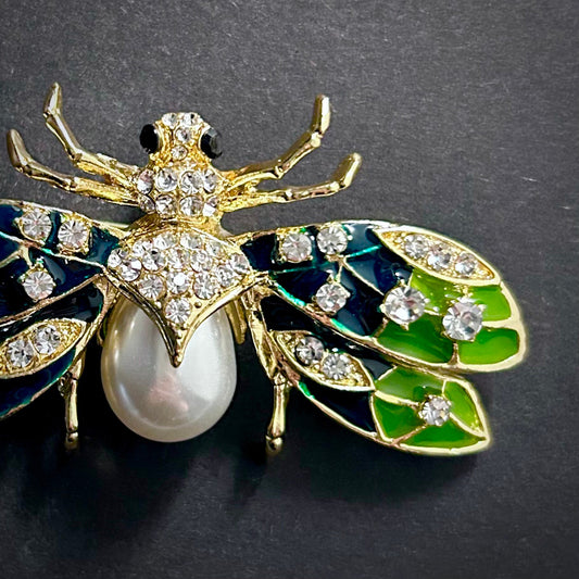 Bee Brooch in Gold, Green Enamel & White Pearl