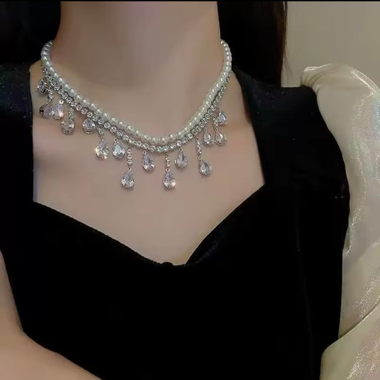 White Pearl & Teardrop Rhinestone Two Row Choker