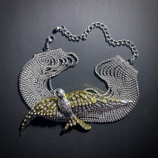 Large Bird & Rhinestone Chain Mixed Metal Statement Choker Necklace