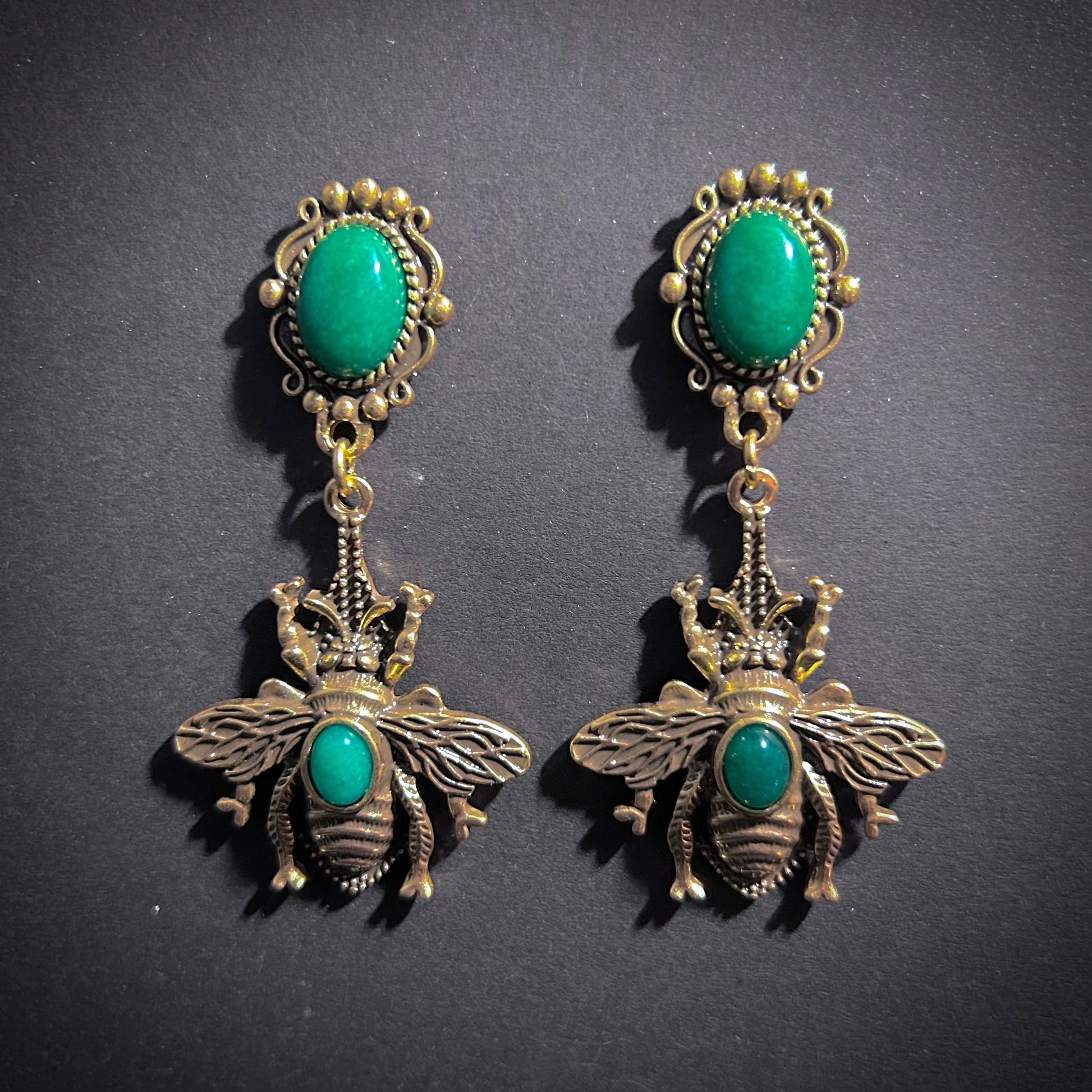 Gorgeous statement earrings with a charming bee motif and palace green stones set in antiqued gold color settings.