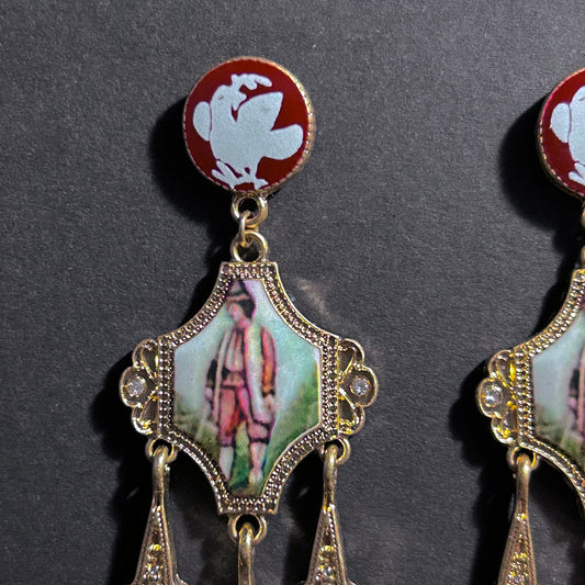 Art Nouveau Enamel Miniature Painting & Milgrain Chandelier Earrings