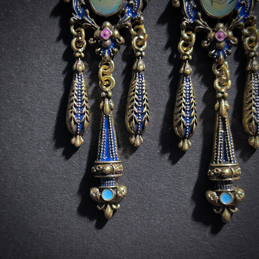 Rococo Enamel, Milgrain & Cherub Chandelier Earrings in Gold & Dark Blue