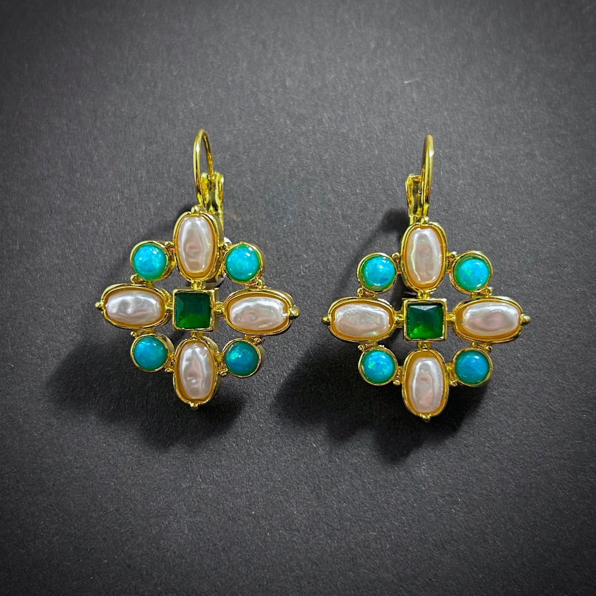 Exquisite Art Nouveau style earrings with snow white faux baroque pearls, faux turquoises and emerald green rhinestones in a shiny gold cross-shaped setting.