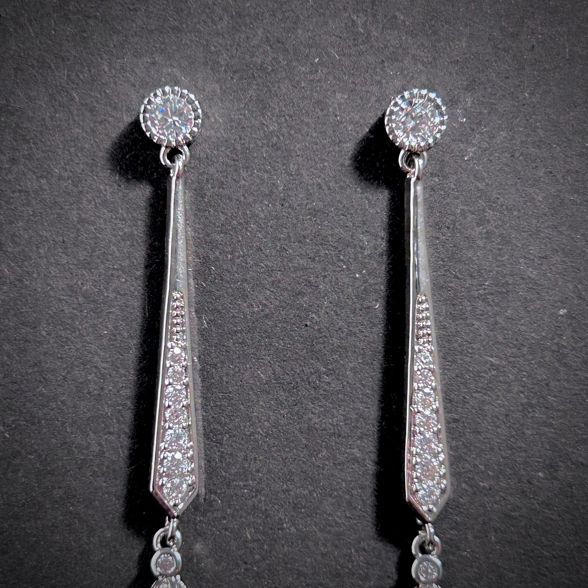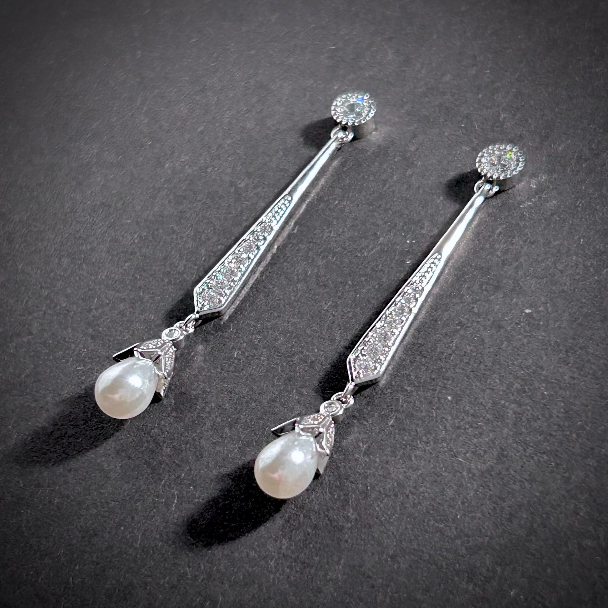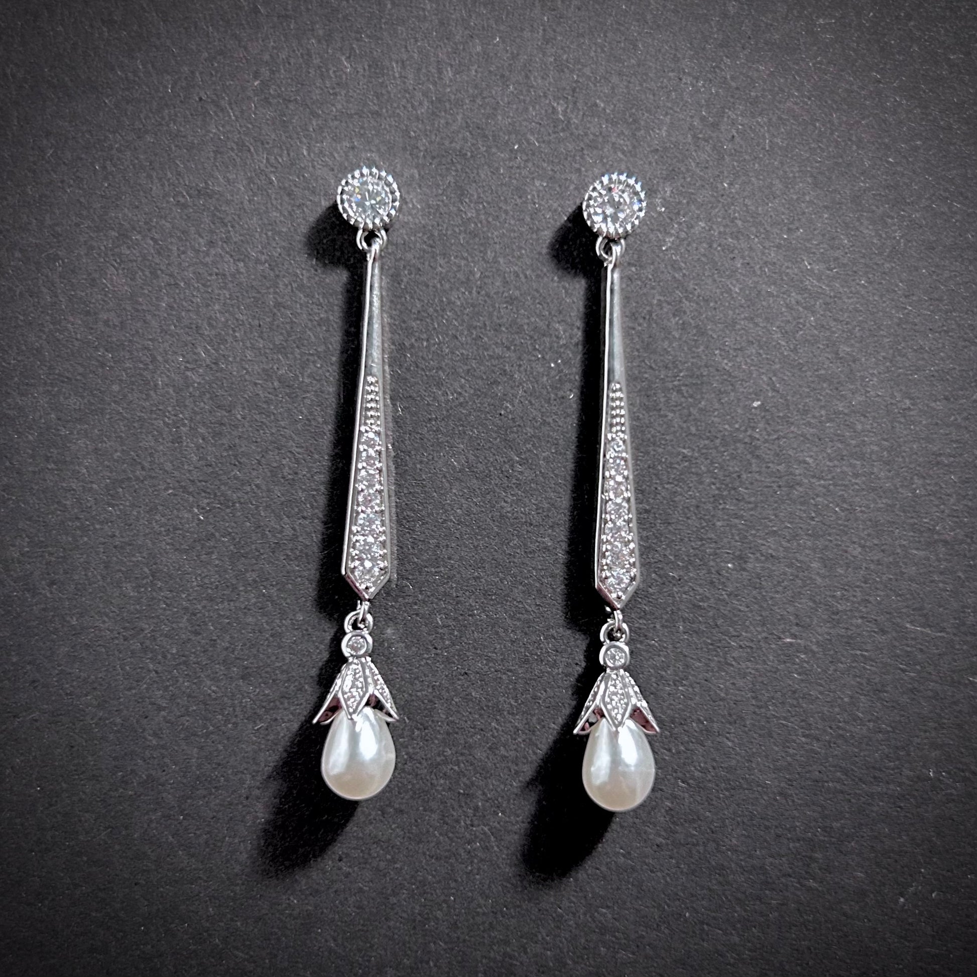 Exquisite yet simple Vintage style earrings with dangling snow white faux pearls and sparkling cubic zirconias in a rhodium plated setting. Classic pearl earrings with just that little bit of something extra.