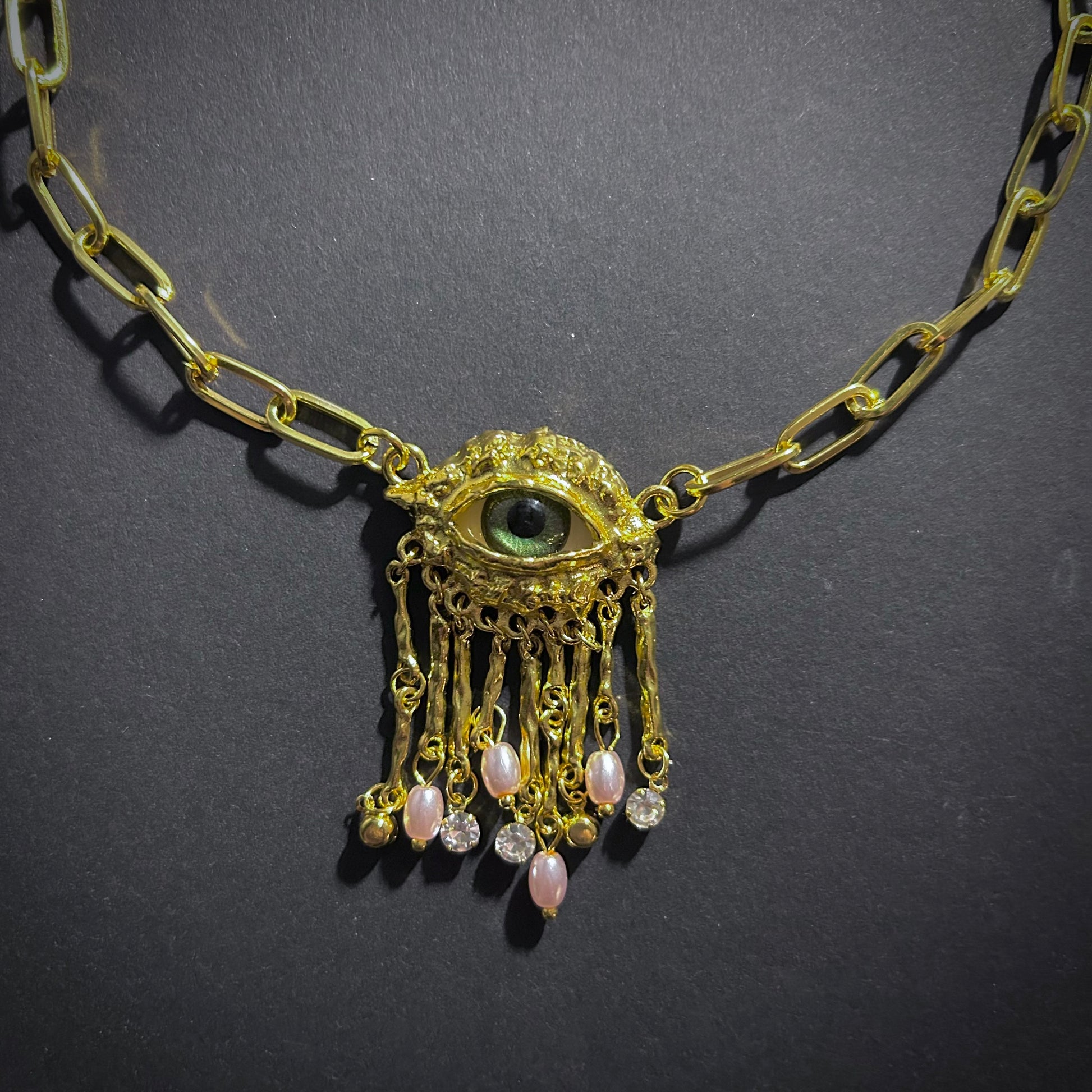 Stunning surrealist style necklace featuring a green realistic eye set in a shiny gold tone setting, with a golden fringe ending in snow white faux pearls and rhinestones dangling underneath.